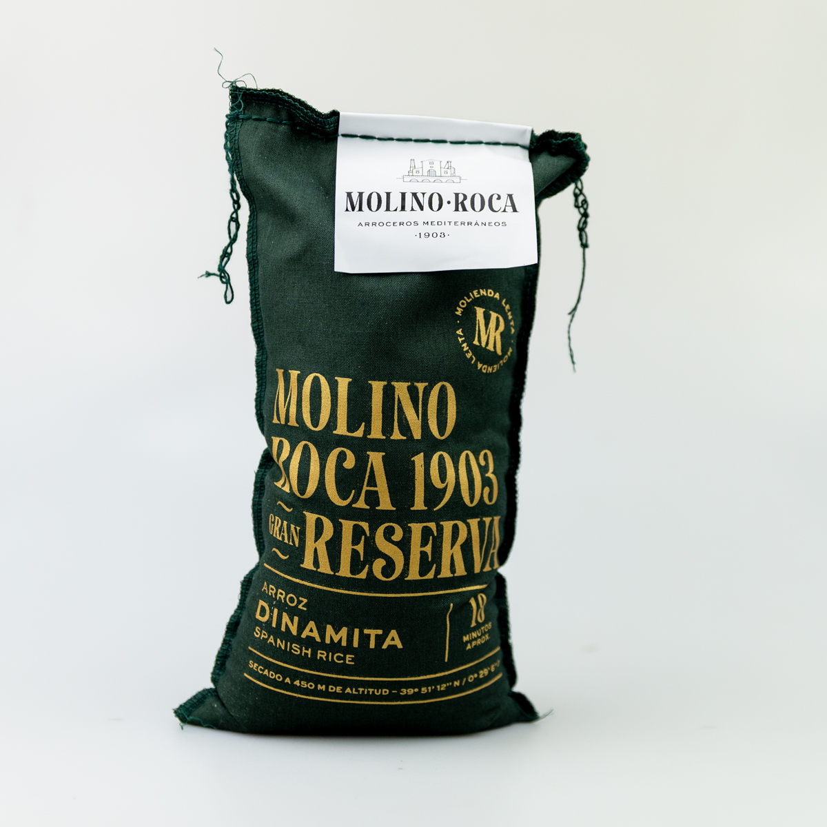 La joya de la corona de Molino Roca, el secreto mejor guardado de la casa. Dinamita es una marca propia, no es una variedad de arroz. De grano pequeño y glutinoso, con una gran capacidad de absorción ideal para que las paellas del domingo adquieran categoría de gran restaurante, con un buen fondo, casi no hace falta ningún ingrediente más. Pasa 2 años madurando antes de salir al mercado y se aconseja hervir durante 20 minutos en agua o caldo. En formato de 5 kilos.
